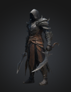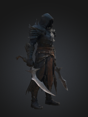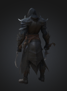 A menacing warrior clad in asymmetrical armor that combines heavy metal plating on one side with flexible leather on the other. His face remains hidden beneath a shadowed hood, creating an air of mystery and dread. The contrasting elements of his attire - rigid vs. flexible, metal vs. leather, light vs. dark - reflect a dual nature, while his imposing silhouette suggests both strength and agility.
