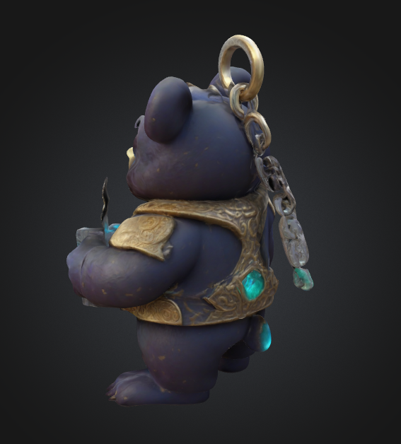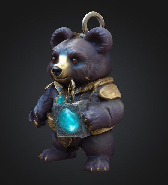 A charming purple-blue bear figurine crafted as a magical pendant or charm, adorned with elaborate golden armor and glowing turquoise gemstones. The bear's friendly face features mesmerizing red eyes that suggest otherworldly awareness, while the intricate golden harness holds a central crystalline book or tablet that pulses with ethereal energy. The combination of cute appearance and mystical elements creates an artifact that balances whimsy with arcane power.