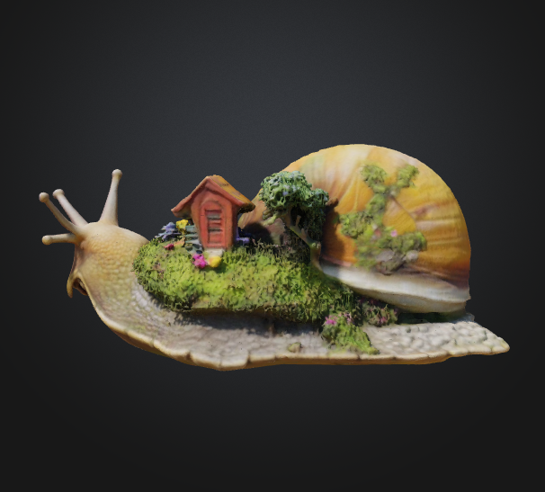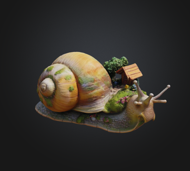 Snail's Solitude is a charming sculpture depicting a peaceful garden snail carrying a tiny homestead on its shell. The snail's body is rendered in warm beige tones, while its shell glows with gentle orange and yellow hues. Perched atop the shell is a small wooden cabin with a welcoming porch, surrounded by lush greenery, tiny mushrooms, and delicate flowers. The scene creates a perfect blend of natural and domestic elements, suggesting a tranquil life in harmony with nature.