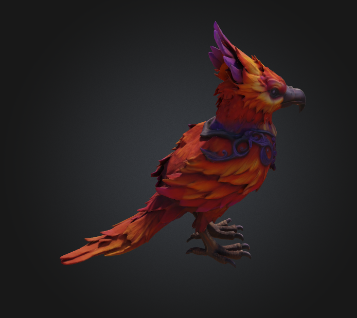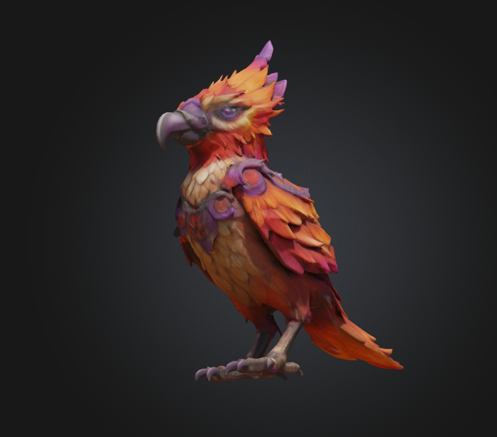 A majestic bird with feathers that mirror the colors of dawn - brilliant oranges, deep purples, and warm golds swirling together in a mesmerizing pattern. Its regal posture and piercing blue eyes suggest ancient wisdom, while its armored purple scales protect vital areas. The creature's feathers seem to flicker and shift like flames in the morning light.