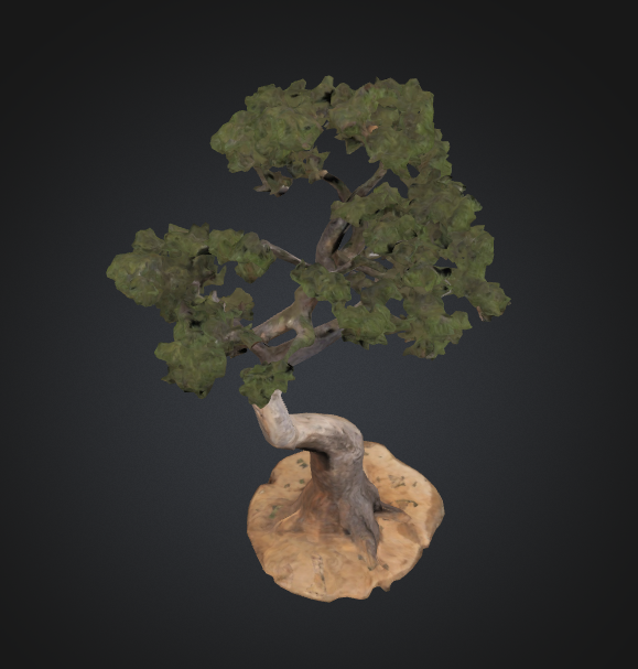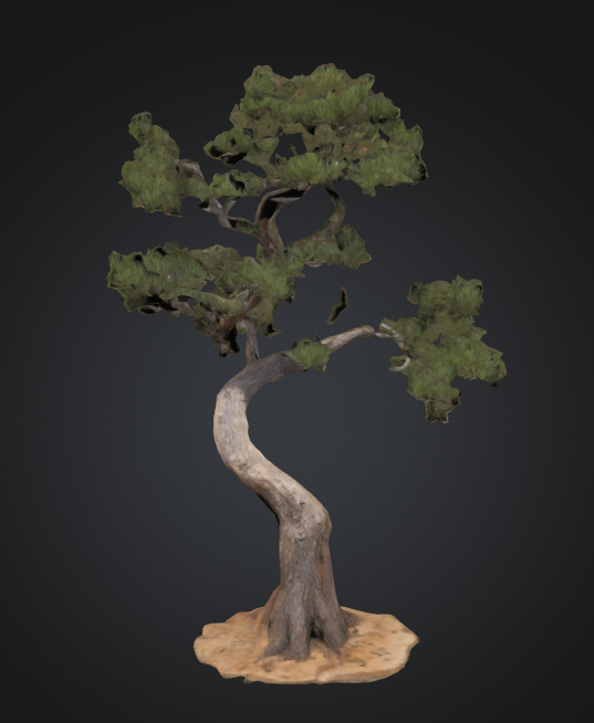 A gracefully curved tree with a sinuous grey trunk that spirals upward like a dancer frozen in motion. Its green canopy spreads in carefully balanced clusters, creating a natural asymmetry that suggests years of thoughtful cultivation. The base sits on a simple earthen platform, emphasizing the tree's dramatic form and the story told by its winding growth.