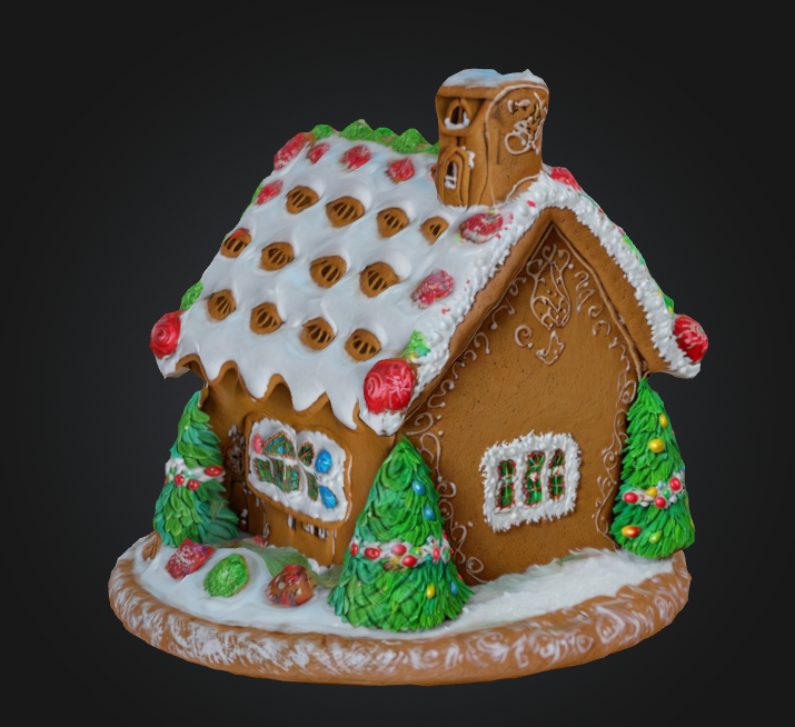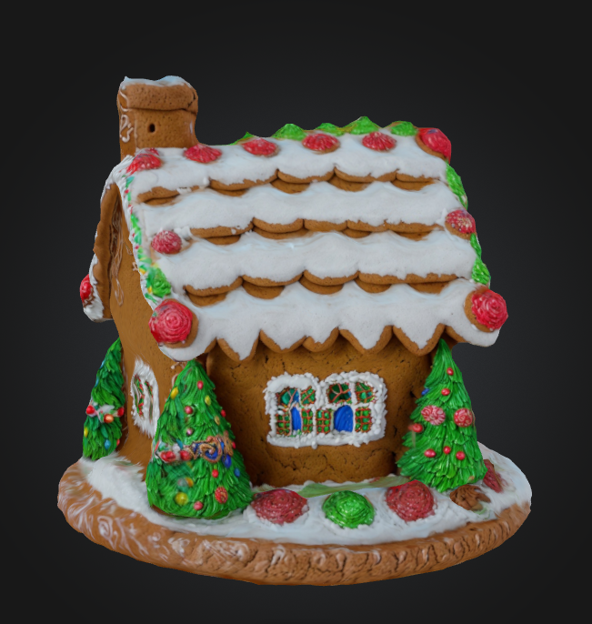 A charming gingerbread house adorned with swirls of white frosting, colorful candies, and miniature evergreen trees. The brown gingerbread walls feature delicate piped designs, while the snow-white roof is decorated with pecan shingles and cherry candies. Tiny windows glow with warmth, and detailed icing creates the illusion of festive decorations around the door and windows.