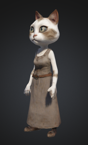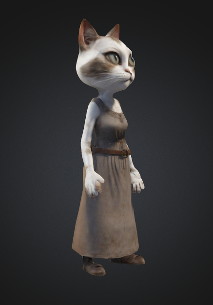 A sophisticated anthropomorphic cat wearing a modest Victorian-era dress with a leather belt. Her cream and siamese coloring complements the earthy tones of her attire, while her large blue eyes convey wisdom and grace. The simple but well-maintained dress suggests a hardworking shopkeeper or craftswoman, while her poised stance reflects quiet dignity.
