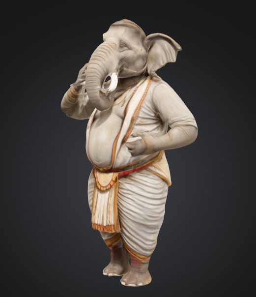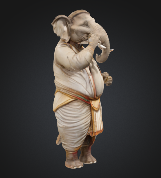 A dignified anthropomorphic elephant figure wearing traditional Indian-inspired white garments with red and gold trim. His thoughtful pose, with one hand raised to his trunk in contemplation, conveys wisdom and gentle authority. The detailed dhoti and decorative waistband show careful craftsmanship, while his round belly and serene expression suggest prosperity and benevolence. The statue's pale stone-like finish gives it the appearance of an ancient sacred artifact.